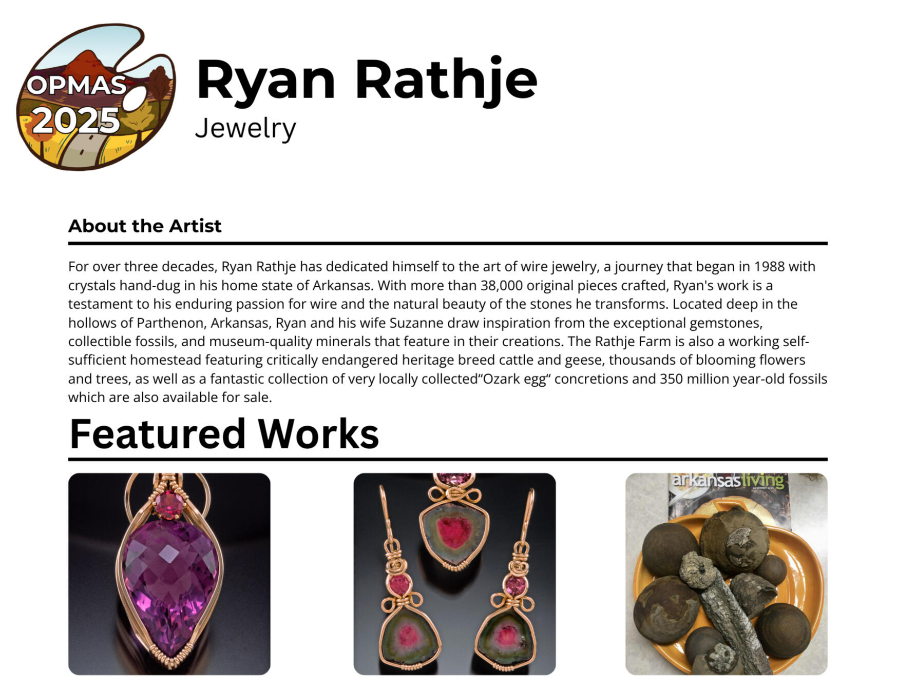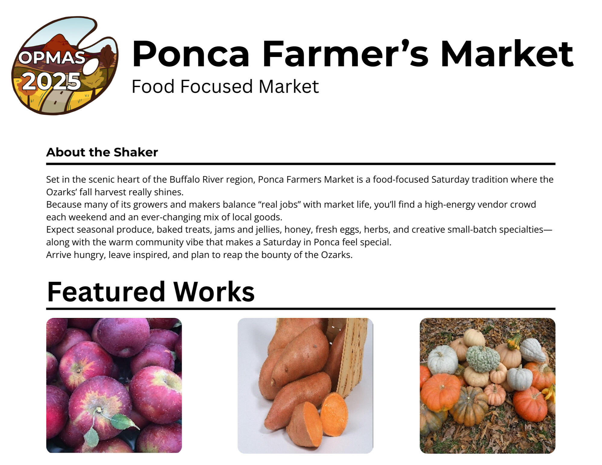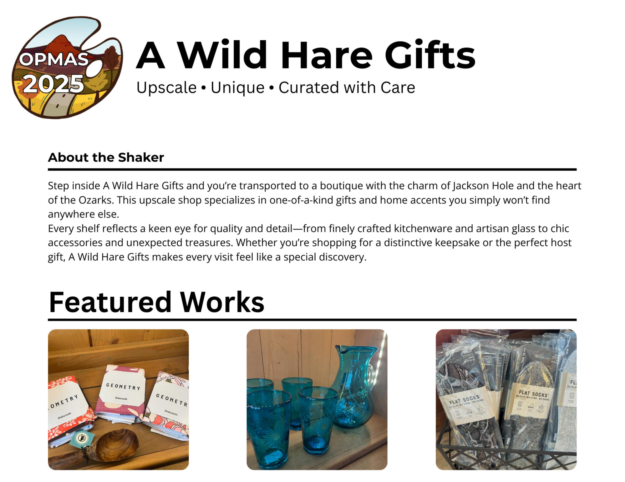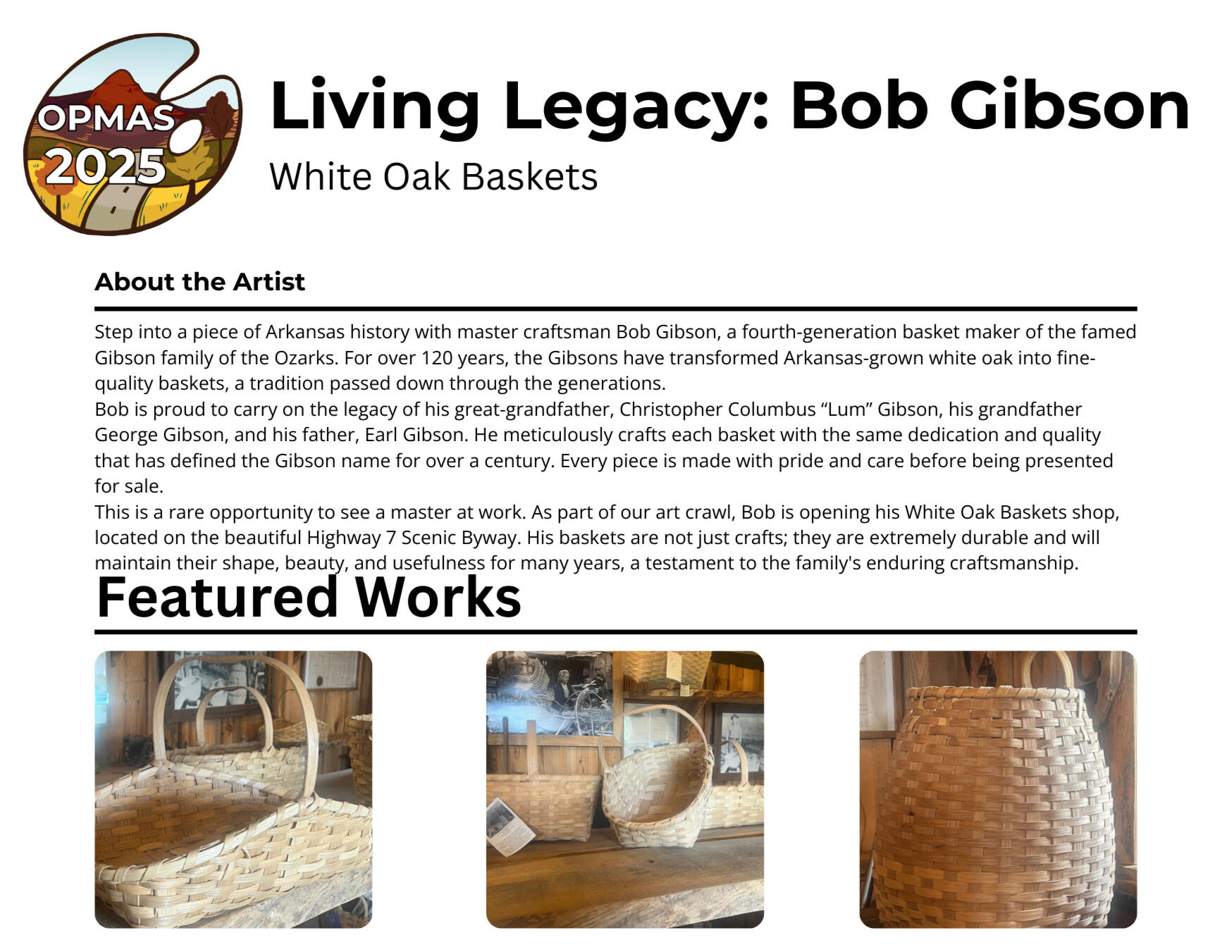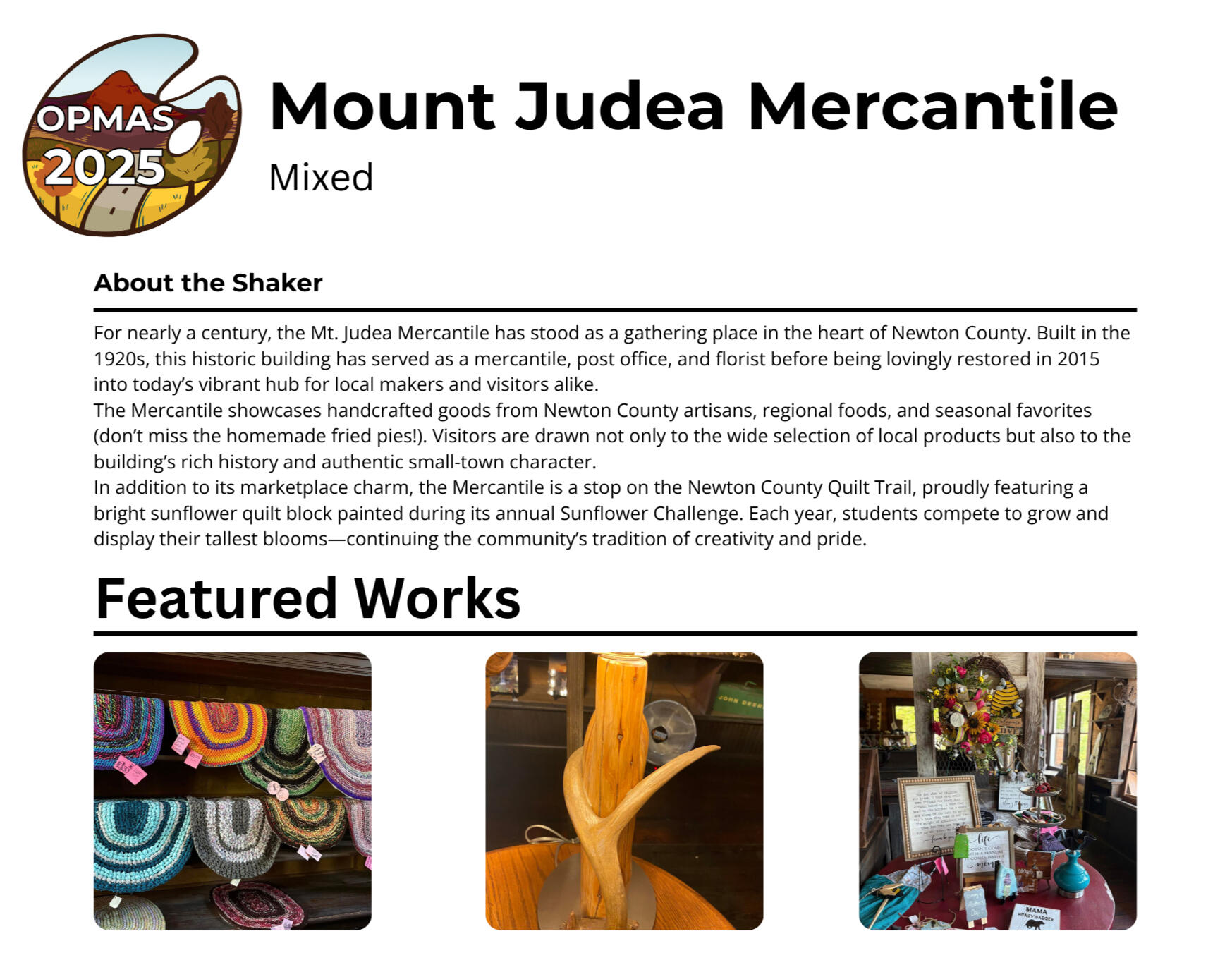 OPMAS stands for Ozark Painters, Makers & Shakers โ a bold new celebration of creativity rooted in the hills and hollers of Newton County, Arkansas.Born from a desire to showcase the incredible talent woven through our community, OPMAS is part art crawl, part homecoming, part handmade revolution.Whether passed down for generations, sparked by necessity, or newly arrived in the Ozarks with fire in their hands, the artists and makers of our region create with heart, soul, and grit. This event is our invitation to see that creativity up close โ to wander, to connect, to be inspired.OPMAS is a 2-day event hosted by the Newton County Chamber of Commerce, bringing painters, potters, woodworkers, jewelers, and dreamers together to share their gifts with neighbors and visitors alike.Itโs more than an art show โ itโs a celebration of place and purpose.